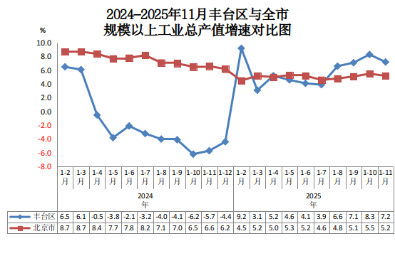 2024-2025年11月丰台区与全市规模以上工业总产值增速对比图