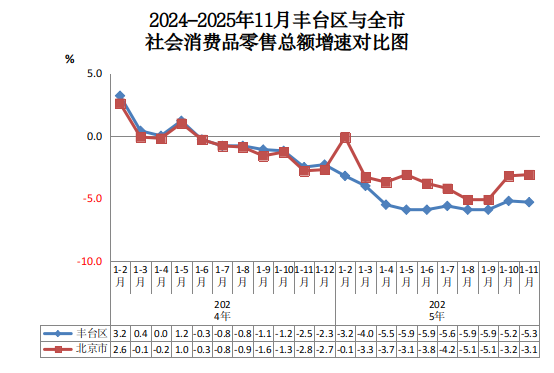 2024-2025年11月丰台区与全市社会消费品零售总额增速对比图