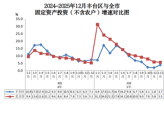 2024-2025年12月丰台区与全市固定资产投资(不含农户)增速对比图