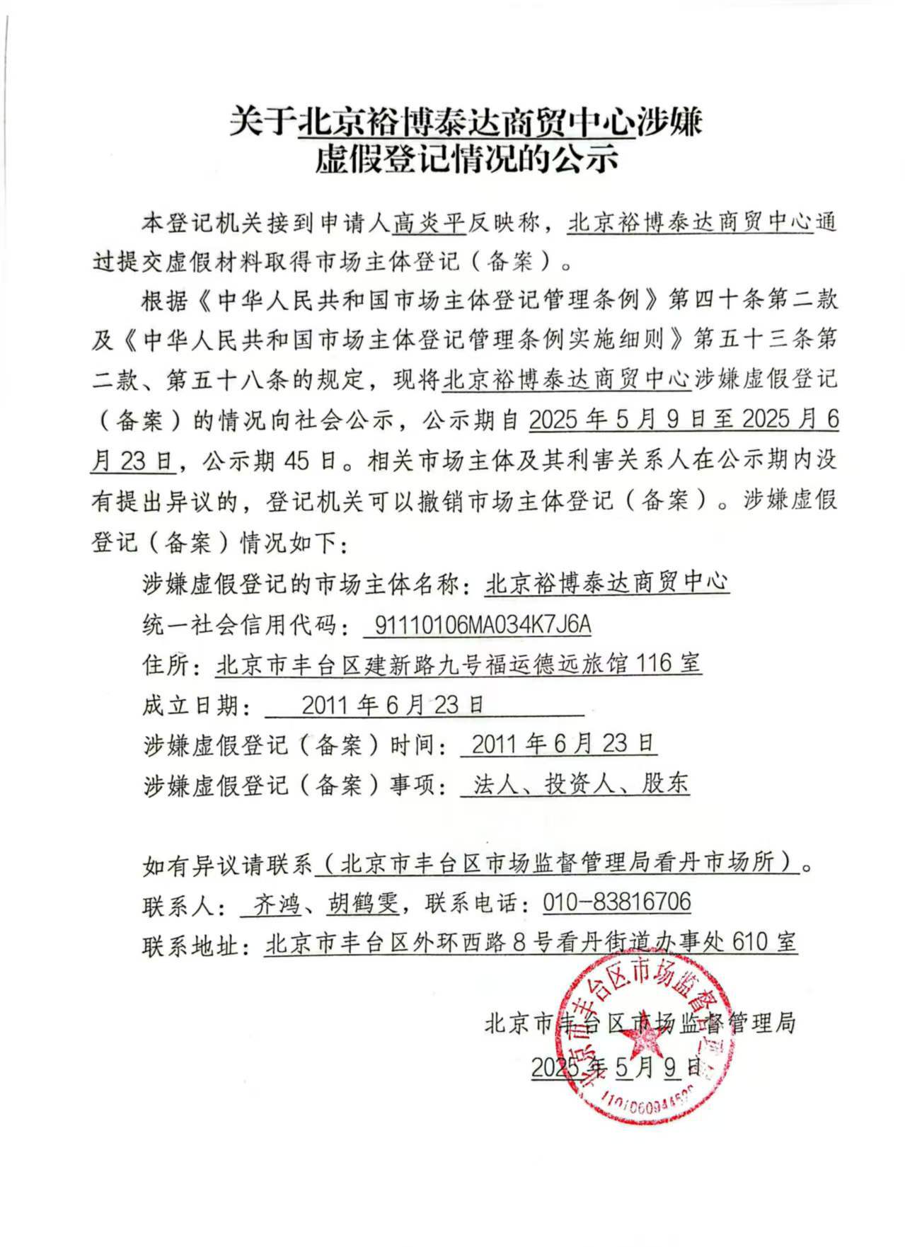 关于北京裕博泰达商贸中心涉嫌虚假登记情况的公示