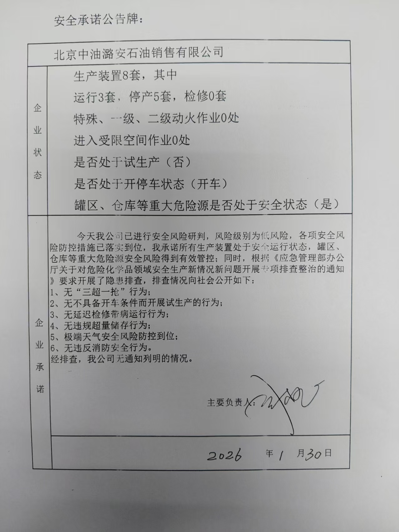 北京中油潞安石油销售有限公司安全承诺公告牌0130