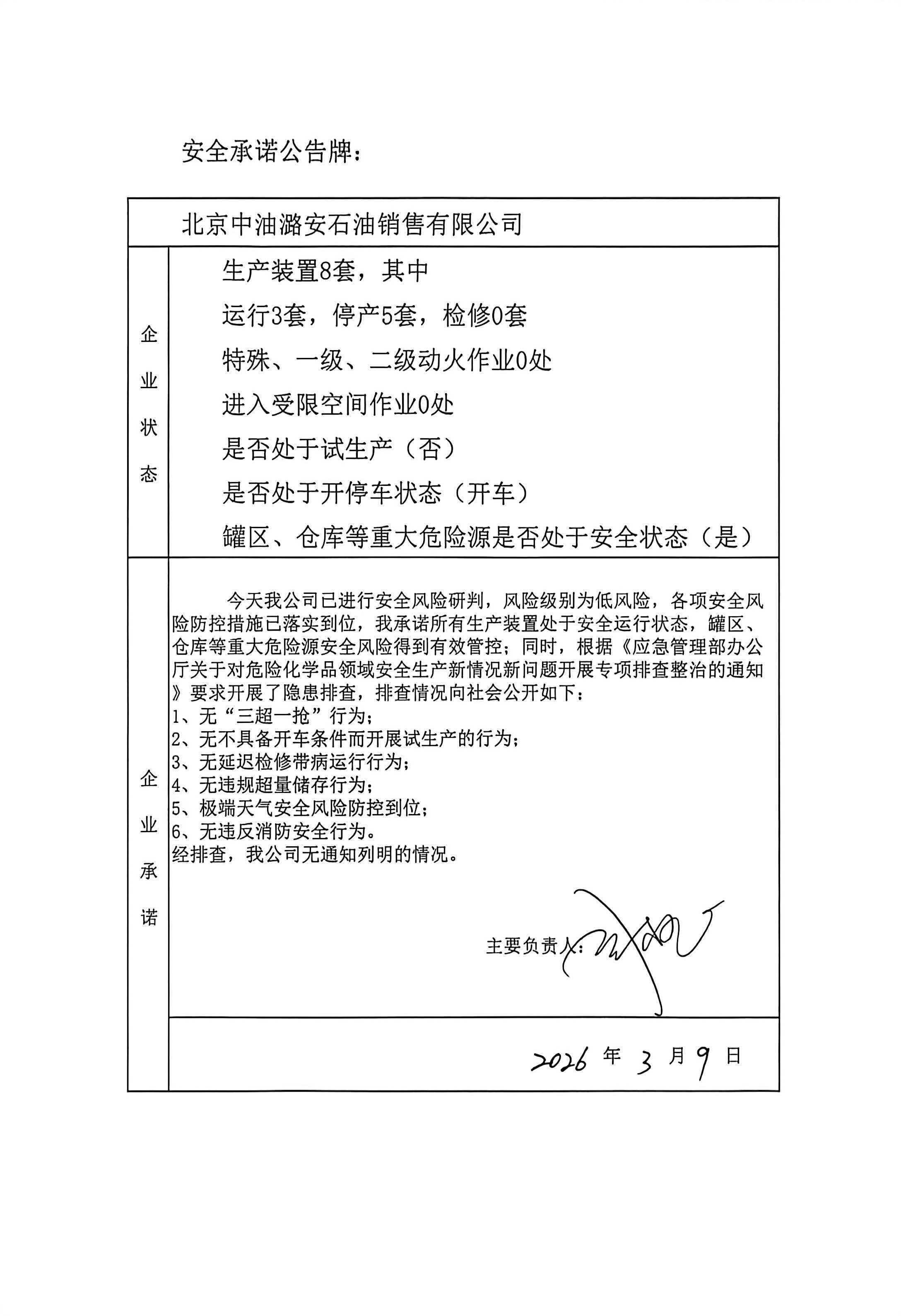 北京中油潞安石油销售有限公司安全承诺公告牌0309