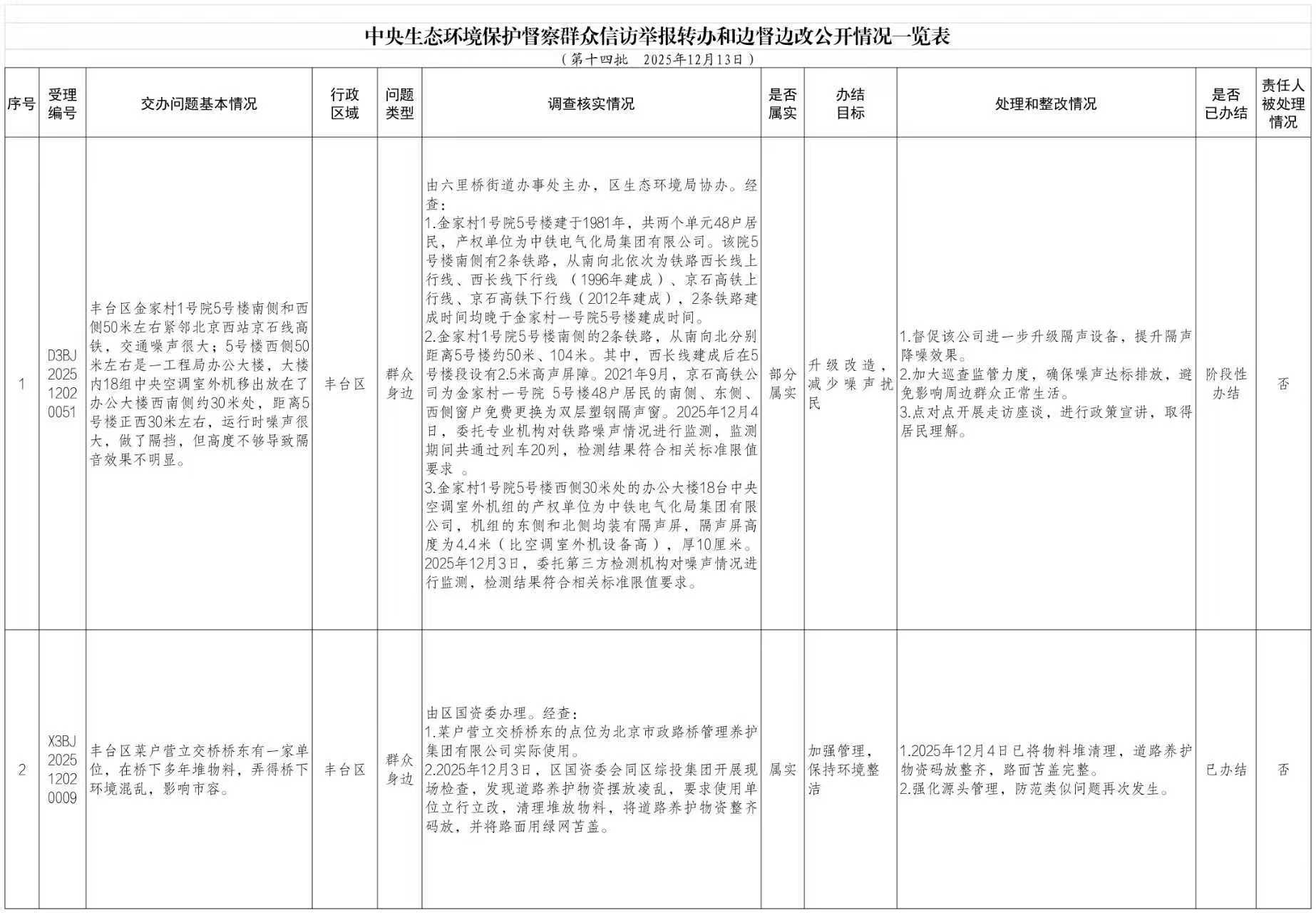2025年12月3日,中央第一生态环境保护督察组向北京市交办第十四批群众信访举报件34件,涉及丰台区2件。现按要求向社会公开本区该批次《中央生态环境保护督察群众信访举报转办和边督边改公开情况一览表》(见下表)。