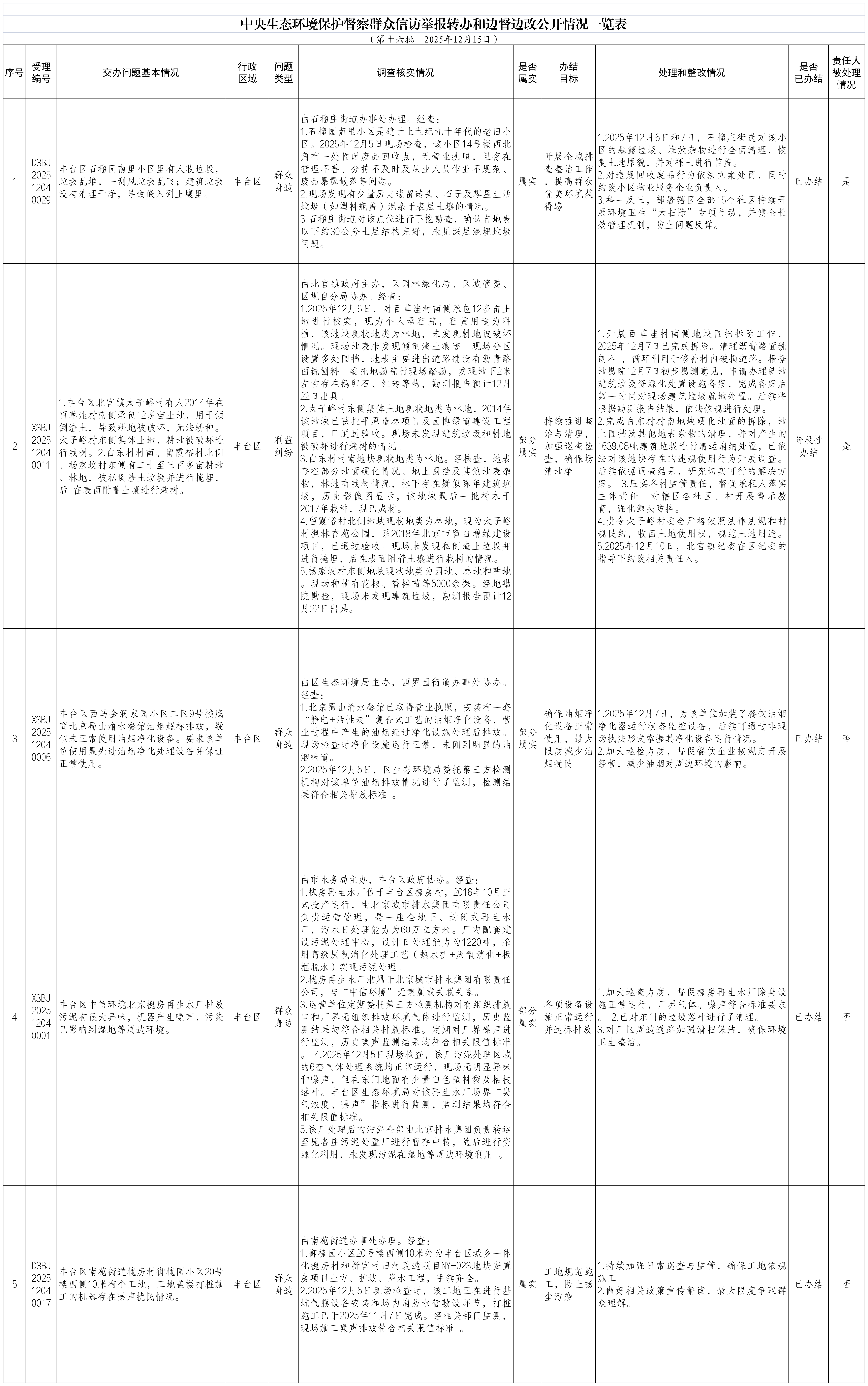 2025年12月5日,中央第一生态环境保护督察组向北京市交办第十六批群众信访举报件34件,涉及丰台区5件。现按要求向社会公开本区该批次《中央生态环境保护督察群众信访举报转办和边督边改公开情况一览表》(见下表)。
