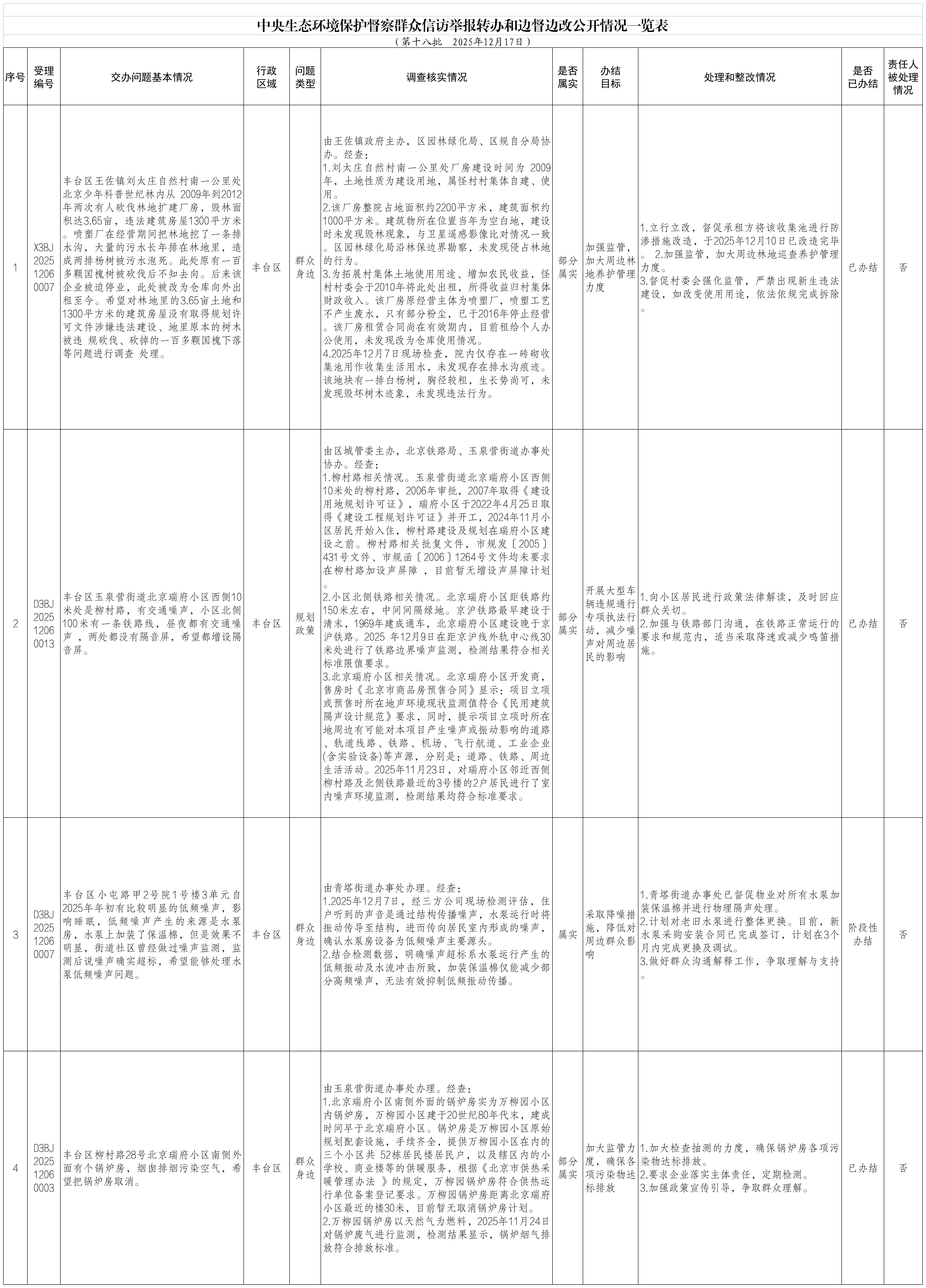 2025年12月7日,中央第一生态环境保护督察组向北京市交办第十八批群众信访举报件37件(其中2件依据有关规定不予公开),涉及丰台区4件。现按要求向社会公开本区该批次《中央生态环境保护督察群众信访举报转办和边督边改公开情况一览表》(见下表)。