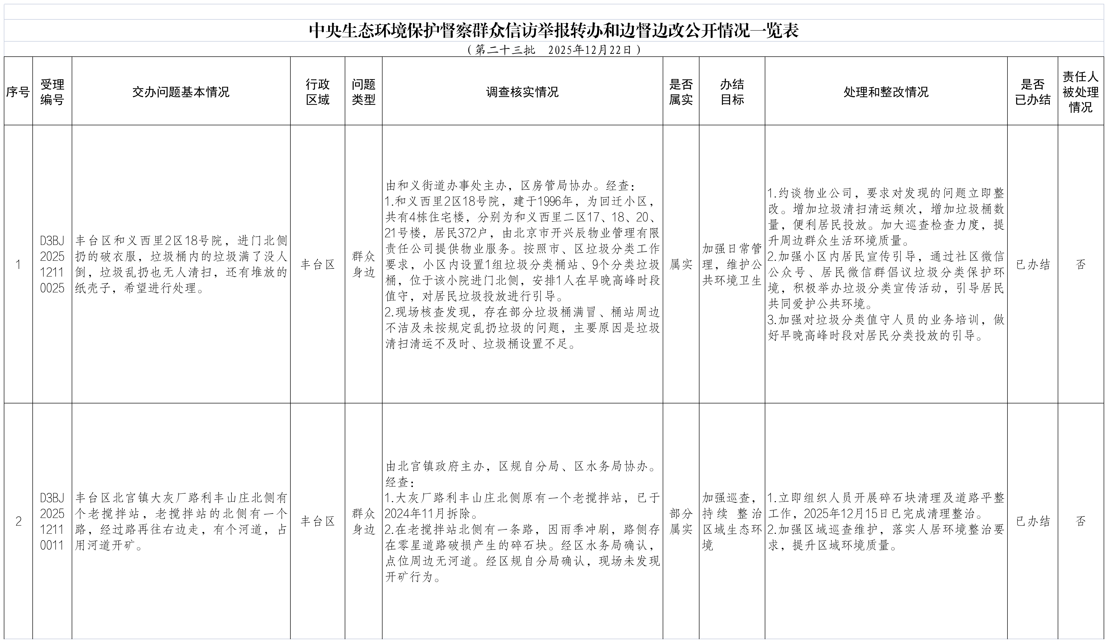 2025年12月12日,中央第一生态环境保护督察组向北京市交办第二十三批群众信访举报件40件,涉及丰台区2件。现按要求向社会公开本区该批次《中央生态环境保护督察群众信访举报转办和边督边改公开情况一览表》(见下表)。