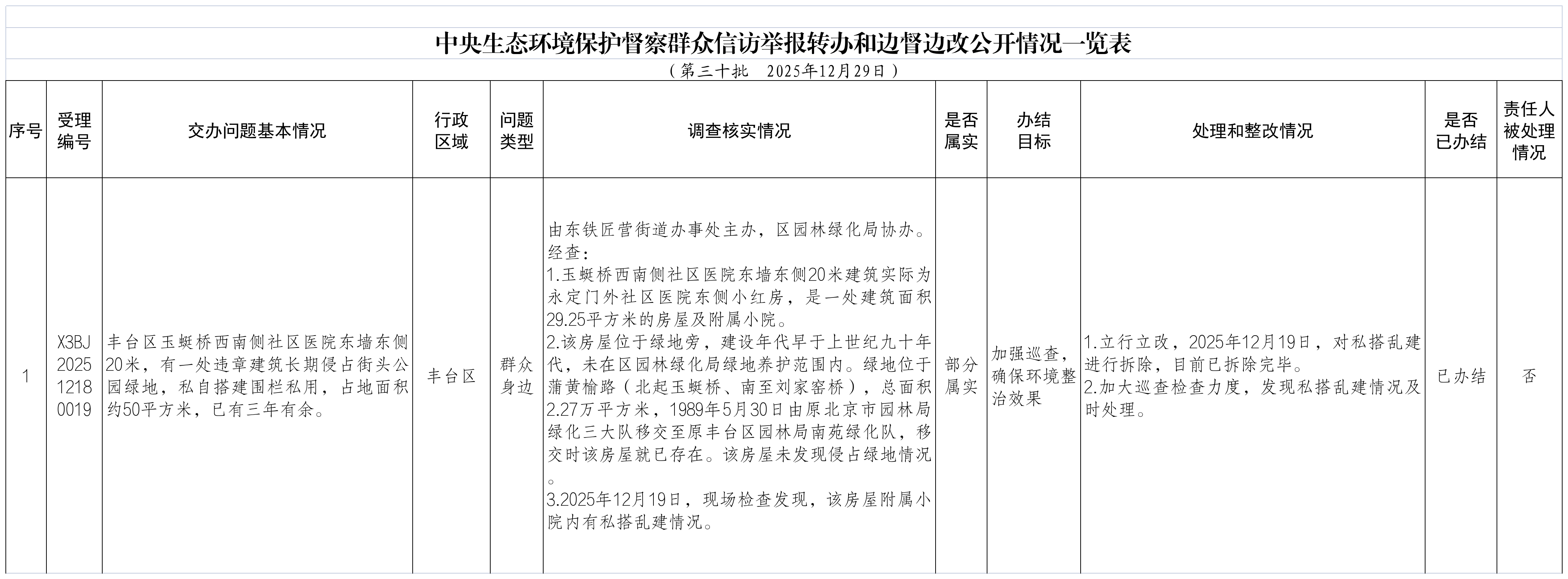 2025年12月19日,中央第一生态环境保护督察组向北京市交办第三十批群众信访举报件33件(其中1件依据有关规定不予公开),涉及丰台区1件。现按要求向社会公开本区该批次《中央生态环境保护督察群众信访举报转办和边督边改公开情况一览表》(见下表)。